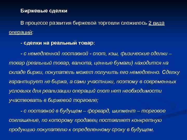 Биржевые сделки В процессе развития биржевой торговли сложилось 2 вида операций: - сделки на реальный товар: - с немедленной поставкой - спот, кэш, физические сделки – товар (реальный товар, валюта, ценные бумаги) находится на складе биржи, покупатель может получить его немедленно. Сделку гарантирует не биржа, а сами участники, поэтому в современных условиях для реализации операций спот необходимости участвовать в биржевой торговле; - с поставкой в будущем – форвард, шипмент – торговое соглашение, по которому продавец поставляет конкретную продукцию покупателю к определенному сроку в будущем.