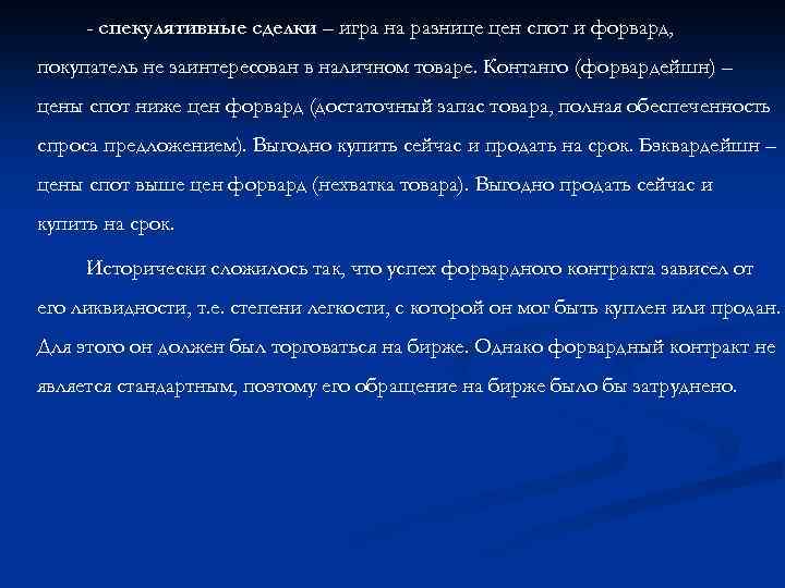 - спекулятивные сделки – игра на разнице цен спот и форвард, покупатель не заинтересован в наличном товаре. Контанго (форвардейшн) – цены спот ниже цен форвард (достаточный запас товара, полная обеспеченность спроса предложением). Выгодно купить сейчас и продать на срок. Бэквардейшн – цены спот выше цен форвард (нехватка товара). Выгодно продать сейчас и купить на срок. Исторически сложилось так, что успех форвардного контракта зависел от его ликвидности, т. е. степени легкости, с которой он мог быть куплен или продан. Для этого он должен был торговаться на бирже. Однако форвардный контракт не является стандартным, поэтому его обращение на бирже было бы затруднено.