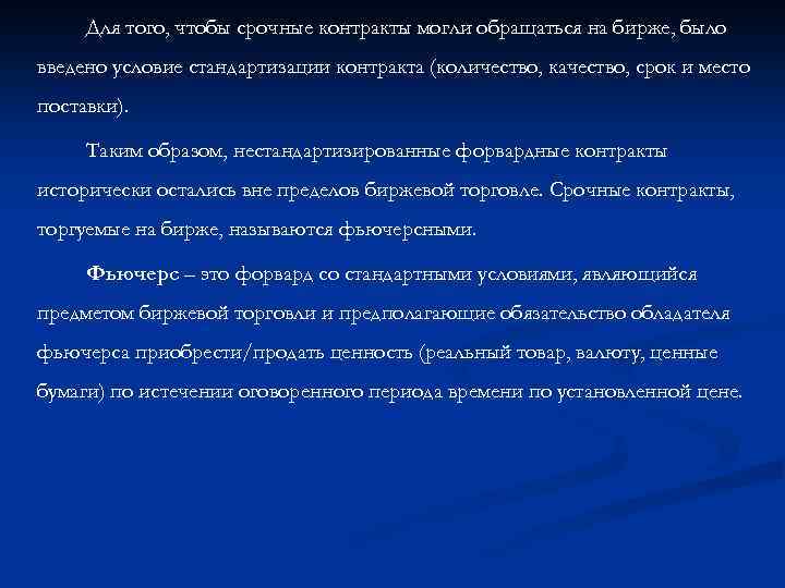 Для того, чтобы срочные контракты могли обращаться на бирже, было введено условие стандартизации контракта (количество, качество, срок и место поставки). Таким образом, нестандартизированные форвардные контракты исторически остались вне пределов биржевой торговле. Срочные контракты, торгуемые на бирже, называются фьючерсными. Фьючерс – это форвард со стандартными условиями, являющийся предметом биржевой торговли и предполагающие обязательство обладателя фьючерса приобрести/продать ценность (реальный товар, валюту, ценные бумаги) по истечении оговоренного периода времени по установленной цене.