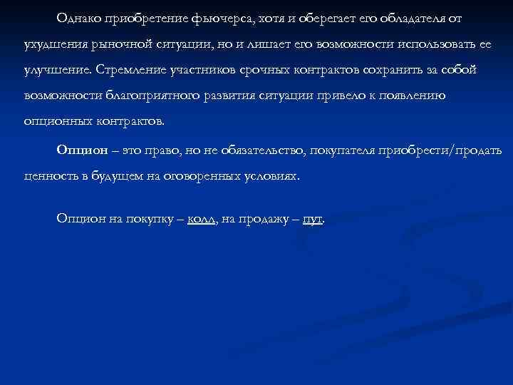 Однако приобретение фьючерса, хотя и оберегает его обладателя от ухудшения рыночной ситуации, но и лишает его возможности использовать ее улучшение. Стремление участников срочных контрактов сохранить за собой возможности благоприятного развития ситуации привело к появлению опционных контрактов. Опцион – это право, но не обязательство, покупателя приобрести/продать ценность в будущем на оговоренных условиях. Опцион на покупку – колл, на продажу – пут.
