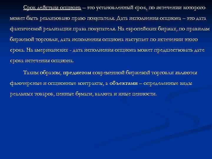 Срок действия опциона – это установленный срок, по истечении которого может быть реализовано право покупателя. Дата исполнения опциона – это дата фактической реализации права покупателя. На европейских биржах, по правилам биржевой торговли, дата исполнения опциона наступает по истечении этого срока. На американских - дата исполнения опциона может предшествовать дате срока истечения опциона. Таким образом, предметом современной биржевой торговли являются фьючерсные и опционные контракты, а объектами – определенные виды реальных товаров, ценные бумаги, валюта и иные ценности.