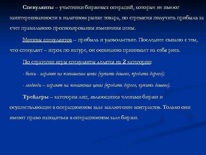 Спекулянты – участники биржевых операций, которые не имеют заинтересованности в наличном рынке товара, но стремятся получить прибыль за счет правильного прогнозирования изменения цены. Мотивы спекулянтов – прибыль и удовольствие. Последнее связано с тем, что спекулянт – игрок по натуре, он осознанно принимает на себя риск. По стратегии игры спекулянты делятся на 2 категории: - быки - играют на повышение цены (купить дешево, продать дорого); - медведи – играют на понижение цены (продать дорого, купить дешево). Трейдеры – категория лиц, являющихся членами биржи и осуществляющие в операционном зале заключение контрактов. Только они имеют право находиться в операционном зале биржи.