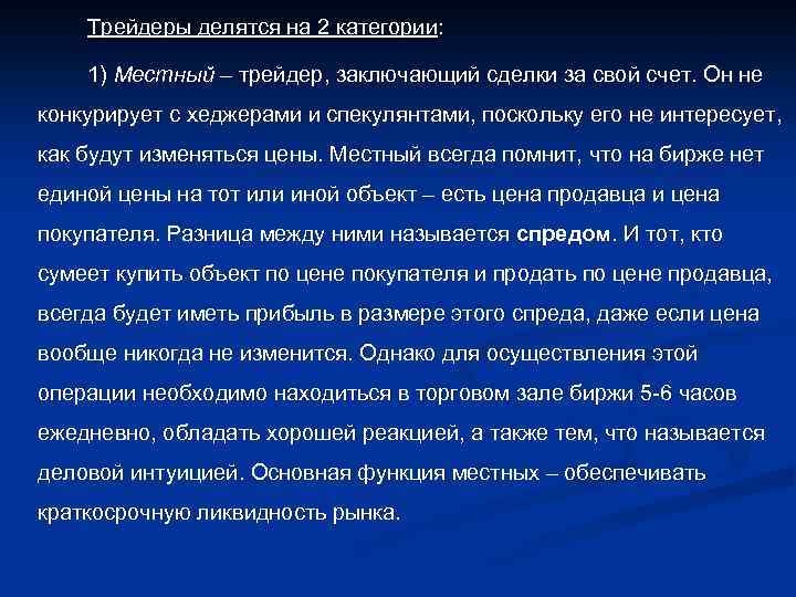 Трейдеры делятся на 2 категории: 1) Местный – трейдер, заключающий сделки за свой счет. Он не конкурирует с хеджерами и спекулянтами, поскольку его не интересует, как будут изменяться цены. Местный всегда помнит, что на бирже нет единой цены на тот или иной объект – есть цена продавца и цена покупателя. Разница между ними называется спредом. И тот, кто сумеет купить объект по цене покупателя и продать по цене продавца, всегда будет иметь прибыль в размере этого спреда, даже если цена вообще никогда не изменится. Однако для осуществления этой операции необходимо находиться в торговом зале биржи 5 -6 часов ежедневно, обладать хорошей реакцией, а также тем, что называется деловой интуицией. Основная функция местных – обеспечивать краткосрочную ликвидность рынка.