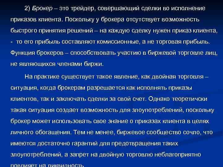 2) Брокер – это трейдер, совершающий сделки во исполнение приказов клиента. Поскольку у брокера отсутствует возможность быстрого принятия решений – на каждую сделку нужен приказ клиента, - то его прибыль составляют комиссионные, а не торговая прибыль. Функция брокеров – способствовать участию в биржевой торговле лиц, не являющихся членами биржи. На практике существует такое явление, как двойная торговля – ситуация, когда брокерам разрешается как исполнять приказы клиентов, так и заключать сделки за свой счет. Однако теоретичски такая ситуация создает возможность для злоупотреблений, поскольку брокер может использовать свое знание о приказах клиента в целях личного обогащения. Тем не менее, биржевое сообщество сочло, что имеются достаточно гарантий для предотвращения таких злоупотреблений, а запрет на двойную торговлю неблагоприятно