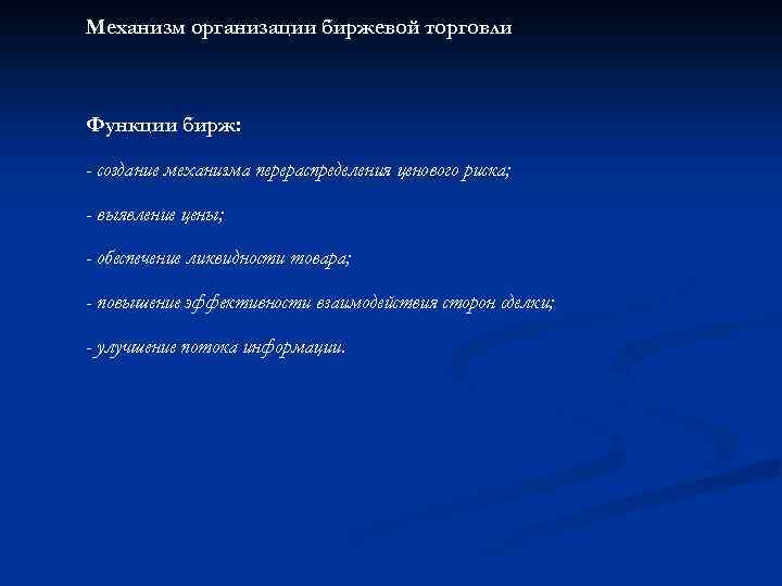 Механизм организации биржевой торговли Функции бирж: - создание механизма перераспределения ценового риска; - выявление цены; - обеспечение ликвидности товара; - повышение эффективности взаимодействия сторон сделки; - улучшение потока информации.