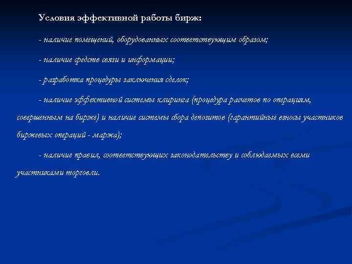 Условия эффективной работы бирж: - наличие помещений, оборудованных соответствующим образом; - наличие средств связи и информации; - разработка процедуры заключения сделок; - наличие эффективной системы клиринга (процедура расчетов по операциям, совершенным на бирже) и наличие системы сбора депозитов (гарантийные взносы участников биржевых операций - маржа); - наличие правил, соответствующих законодательству и соблюдаемых всеми участниками торговли.