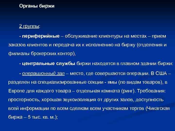 Органы биржи 2 группы: - периферийные – обслуживание клиентуры на местах – прием заказов клиентов и передача их к исполнению на биржу (отделения и филиалы брокерских контор), - центральные службы биржи находятся в главном здании биржи: - операционный зал – место, где совершаются операции. В США – разделен на специализированные секции - ямы (по видам товаров), в Европе для каждого товара – отдельная комната (ринг). Требования: просторность, хорошая звукоизоляция от других залов, доступность всей информации по всем сделкам всем участникам торгов (Чикагская биржа – 5 тыс. кв. м. );