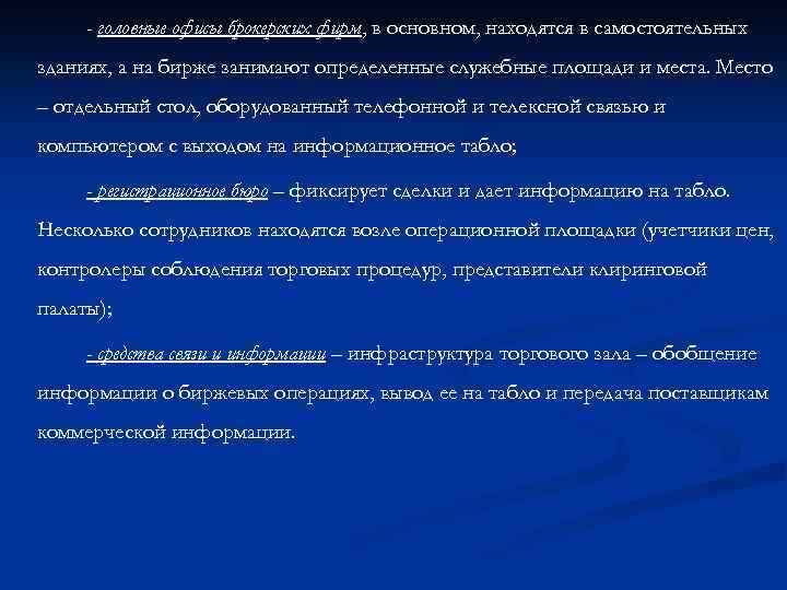 - головные офисы брокерских фирм, в основном, находятся в самостоятельных зданиях, а на бирже занимают определенные служебные площади и места. Место – отдельный стол, оборудованный телефонной и телексной связью и компьютером с выходом на информационное табло; - регистрационное бюро – фиксирует сделки и дает информацию на табло. Несколько сотрудников находятся возле операционной площадки (учетчики цен, контролеры соблюдения торговых процедур, представители клиринговой палаты); - средства связи и информации – инфраструктура торгового зала – обобщение информации о биржевых операциях, вывод ее на табло и передача поставщикам коммерческой информации.
