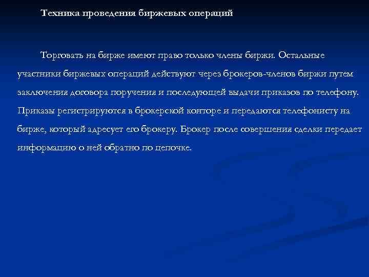 Техника проведения биржевых операций Торговать на бирже имеют право только члены биржи. Остальные участники биржевых операций действуют через брокеров-членов биржи путем заключения договора поручения и последующей выдачи приказов по телефону. Приказы регистрируются в брокерской конторе и передаются телефонисту на бирже, который адресует его брокеру. Брокер после совершения сделки передает информацию о ней обратно по цепочке.