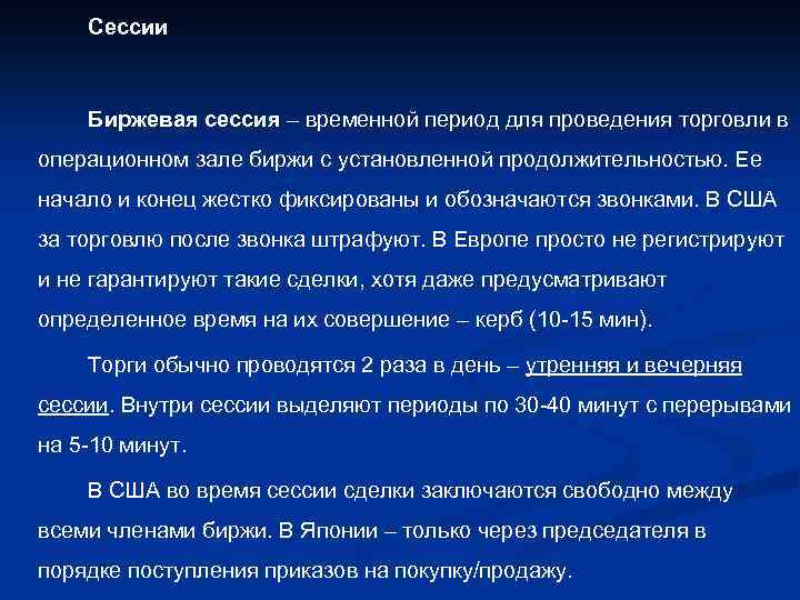 Сессии Биржевая сессия – временной период для проведения торговли в операционном зале биржи с установленной продолжительностью. Ее начало и конец жестко фиксированы и обозначаются звонками. В США за торговлю после звонка штрафуют. В Европе просто не регистрируют и не гарантируют такие сделки, хотя даже предусматривают определенное время на их совершение – керб (10 -15 мин). Торги обычно проводятся 2 раза в день – утренняя и вечерняя сессии. Внутри сессии выделяют периоды по 30 -40 минут с перерывами на 5 -10 минут. В США во время сессии сделки заключаются свободно между всеми членами биржи. В Японии – только через председателя в порядке поступления приказов на покупку/продажу.