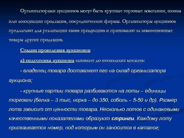 Организаторами аукционов могут быть крупные торговые компании, союзы или ассоциации продавцов, посреднические фирмы. Организаторы аукционов предлагают для реализации свою продукцию и принимают за комиссионные товары других продавцов. Стадии проведения аукционов а) подготовка аукциона занимает до нескольких месяцев: - владелец товара доставляет его на склад организатора аукциона; - крупные партии товара разбиваются на лоты – единицы торговли (белка – 3 тыс, норка – до 350, соболь – 5 -50 и др). Размер лота зависит от ценности товара. Несколько лотов с одинаковыми качественными показателями образуют стринги. Каждому лоту присваивается номер, под которым он заносится в каталог;