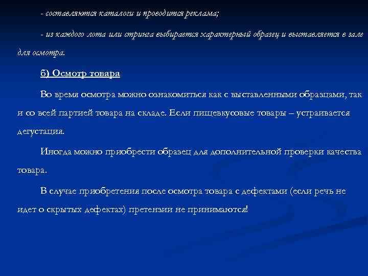 - составляются каталоги и проводится реклама; - из каждого лота или стринга выбирается характерный образец и выставляется в зале для осмотра. б) Осмотр товара Во время осмотра можно ознакомиться как с выставленными образцами, так и со всей партией товара на складе. Если пищевкусовые товары – устраивается дегустация. Иногда можно приобрести образец для дополнительной проверки качества товара. В случае приобретения после осмотра товара с дефектами (если речь не идет о скрытых дефектах) претензии не принимаются!