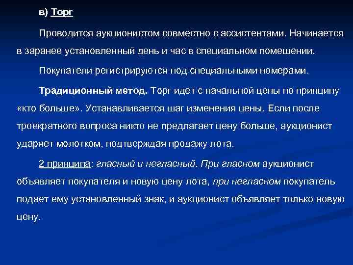 в) Торг Проводится аукционистом совместно с ассистентами. Начинается в заранее установленный день и час в специальном помещении. Покупатели регистрируются под специальными номерами. Традиционный метод. Торг идет с начальной цены по принципу «кто больше» . Устанавливается шаг изменения цены. Если после троекратного вопроса никто не предлагает цену больше, аукционист ударяет молотком, подтверждая продажу лота. 2 принципа: гласный и негласный. При гласном аукционист объявляет покупателя и новую цену лота, при негласном покупатель подает ему установленный знак, и аукционист объявляет только новую цену.