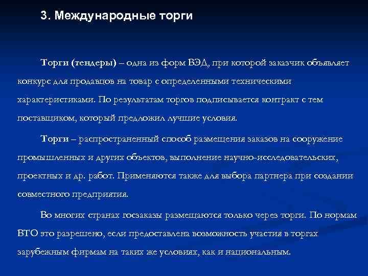 3. Международные торги Торги (тендеры) – одна из форм ВЭД, при которой заказчик объявляет конкурс для продавцов на товар с определенными техническими характеристиками. По результатам торгов подписывается контракт с тем поставщиком, который предложил лучшие условия. Торги – распространенный способ размещения заказов на сооружение промышленных и других объектов, выполнение научно-исследовательских, проектных и др. работ. Применяются также для выбора партнера при создании совместного предприятия. Во многих странах госзаказы размещаются только через торги. По нормам ВТО это разрешено, если предоставлена возможность участия в торгах зарубежным фирмам на таких же условиях, как и национальным.
