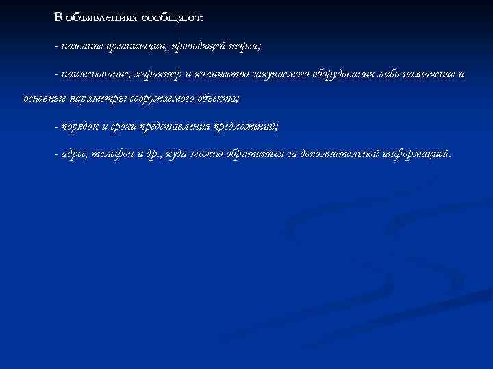 В объявлениях сообщают: - название организации, проводящей торги; - наименование, характер и количество закупаемого оборудования либо назначение и основные параметры сооружаемого объекта; - порядок и сроки представления предложений; - адрес, телефон и др. , куда можно обратиться за дополнительной информацией.