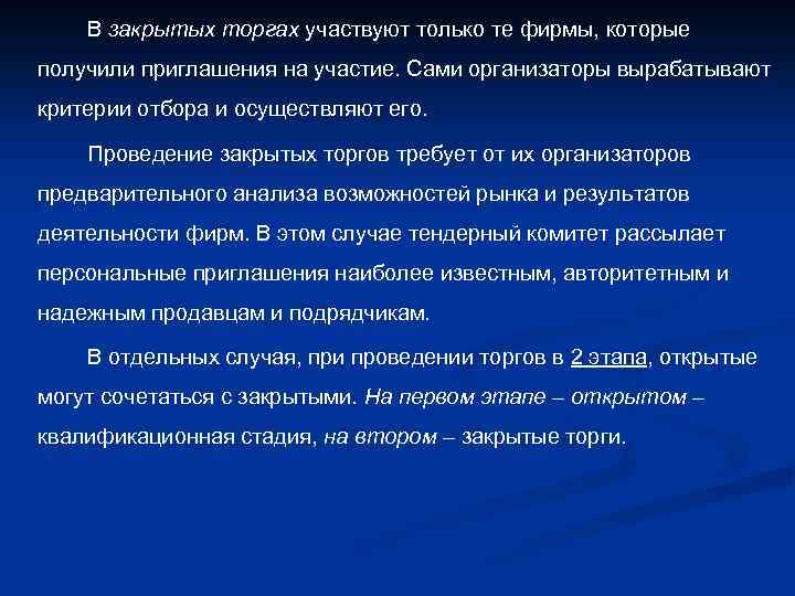 В закрытых торгах участвуют только те фирмы, которые получили приглашения на участие. Сами организаторы вырабатывают критерии отбора и осуществляют его. Проведение закрытых торгов требует от их организаторов предварительного анализа возможностей рынка и результатов деятельности фирм. В этом случае тендерный комитет рассылает персональные приглашения наиболее известным, авторитетным и надежным продавцам и подрядчикам. В отдельных случая, при проведении торгов в 2 этапа, открытые могут сочетаться с закрытыми. На первом этапе – открытом – квалификационная стадия, на втором – закрытые торги.