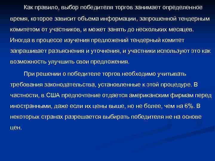 Как правило, выбор победителя торгов занимает определенное время, которое зависит объема информации, запрошенной тендерным комитетом от участников, и может занять до нескольких месяцев. Иногда в процессе изучения предложений тендерный комитет запрашивает разъяснения и уточнения, и участники используют это как возможность улучшить свои предложения. При решении о победителе торгов необходимо учитывать требования законодательства, установленные к этой процедуре. В частности, в США предпочтение отдается американским фирмам перед иностранными, даже если их цены выше, но не более, чем на 6%. В некоторых странах разрешается выбирать победителя не на основе цен.