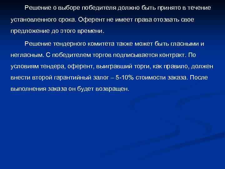 Решение о выборе победителя должно быть принято в течение установленного срока. Оферент не имеет права отозвать свое предложение до этого времени. Решение тендерного комитета также может быть гласными и негласным. С победителем торгов подписывается контракт. По условиям тендера, оферент, выигравший торги, как правило, должен внести второй гарантийный залог – 5 -10% стоимости заказа. После выполнения заказа он будет возвращен.