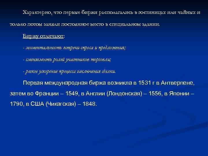 Характерно, что первые биржи располагались в гостиницах или чайных и только потом заняли постоянное место в специальном здании. Биржу отличают: - моментальность встречи спроса и предложения; - сменяемость ролей участников торговли; - резкое ускорение процесса заключения сделки. Первая международная биржа возникла в 1531 г в Антверпене, затем во Франции – 1549, в Англии (Лондонская) – 1556, в Японии – 1790, в США (Чикагская) – 1848.