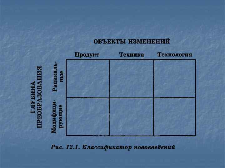Нововведение — это сознательное изменение какого-либо элемента предприятия, части производственной системы, направленное на улучшение ее свойств. ТИПЫ НОВОВВЕДЕНИЙ По объекту изменений n n n Продуктовые нововведения - полностью обновляется или усовершенствуется ранее производимая предприятием продукция (или услуги). Технические нововведения — это изменения в средствах труда. Технологические нововведения - изменения способов создания продукта или оказания услуги. По глубине изменений Модифицирующие изменения не затрагивают базовых характеристик продукта (услуги). Радикальные - кардинально меняют продукт.