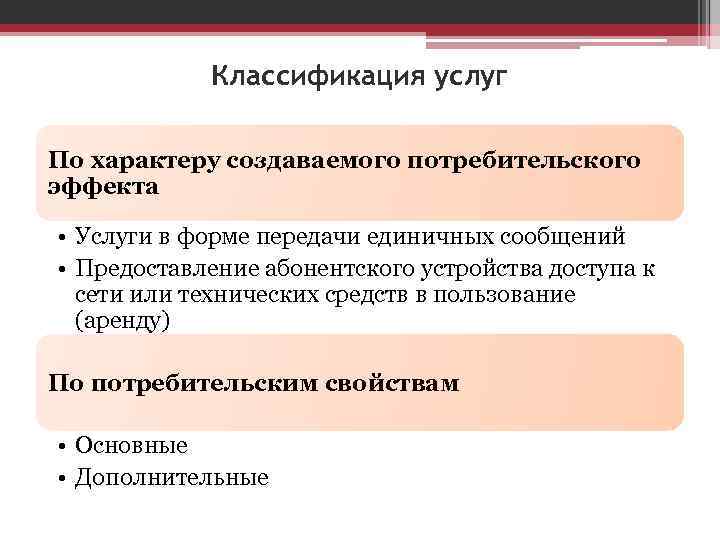 Классификация услуг По характеру создаваемого потребительского эффекта • Услуги в форме передачи единичных сообщений • Предоставление абонентского устройства доступа к сети или технических средств в пользование (аренду) По потребительским свойствам • Основные • Дополнительные