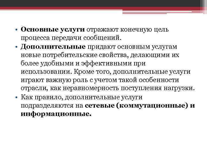 • Основные услуги отражают конечную цель процесса передачи сообщений. • Дополнительные придают основным услугам новые потребительские свойства, делающими их более удобными и эффективными при использовании. Кроме того, дополнительные услуги играют важную роль с учетом такой особенности отрасли, как неравномерность поступления нагрузки. • Как правило, дополнительные услуги подразделяются на сетевые (коммутационные) и информационные.