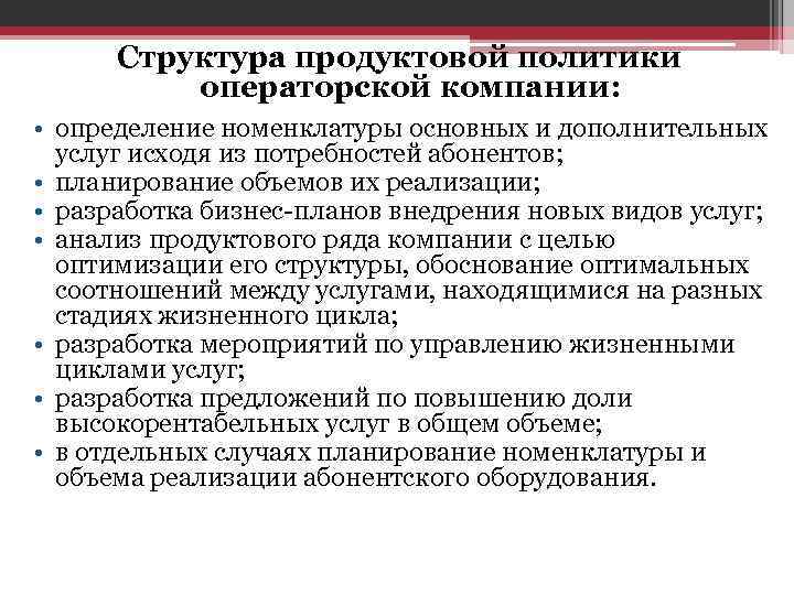 Структура продуктовой политики операторской компании: • определение номенклатуры основных и дополнительных услуг исходя из потребностей абонентов; • планирование объемов их реализации; • разработка бизнес-планов внедрения новых видов услуг; • анализ продуктового ряда компании с целью оптимизации его структуры, обоснование оптимальных соотношений между услугами, находящимися на разных стадиях жизненного цикла; • разработка мероприятий по управлению жизненными циклами услуг; • разработка предложений по повышению доли высокорентабельных услуг в общем объеме; • в отдельных случаях планирование номенклатуры и объема реализации абонентского оборудования.