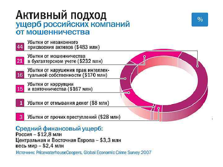 Основные приемы мошенничества • Незаконное присвоение активов или хищение • Искажение отчетности – внесение изменений или представление финансовой отчетности таким образом, чтобы она не отражала истинную стоимость или результаты финансовой деятельности компании • Коррупция и взяточничество – незаконное использование служебного положения • Отмывание денег – легализация денежных средств, полученных незаконным путем • Нарушение прав интеллектуальной собственности – незаконное копирование продукции при нарушении патента или авторских прав, а также незаконное приобретение коммерческих секретов или внутренней информации компании.