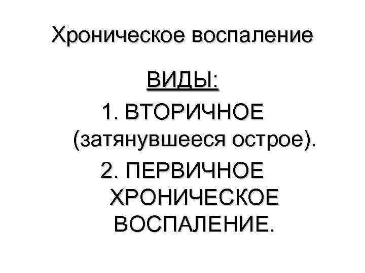 Хроническое воспаление ВИДЫ: 1. ВТОРИЧНОЕ (затянувшееся острое). 2. ПЕРВИЧНОЕ ХРОНИЧЕСКОЕ ВОСПАЛЕНИЕ.
