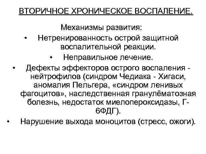 ВТОРИЧНОЕ ХРОНИЧЕСКОЕ ВОСПАЛЕНИЕ. Механизмы развития: • Нетренированность острой защитной воспалительной реакции. • Неправильное лечение. • Дефекты эффекторов острого воспаления нейтрофилов (синдром Чедиака - Хигаси, аномалия Пельгера, «синдром ленивых фагоцитов» , наследственная гранулёматозная болезнь, недостаток миелопероксидазы, Г 6 ФДГ). • Нарушение выхода моноцитов (стресс, ожоги).