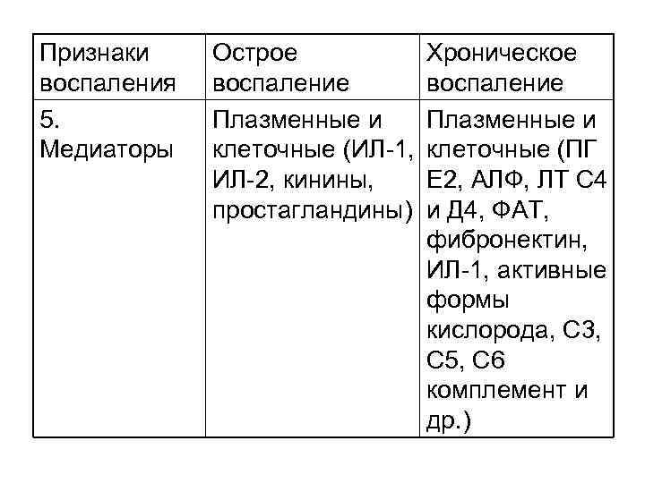 Признаки воспаления 5. Медиаторы Острое воспаление Плазменные и клеточные (ИЛ-1, ИЛ-2, кинины, простагландины) Хроническое воспаление Плазменные и клеточные (ПГ Е 2, АЛФ, ЛТ С 4 и Д 4, ФАТ, фибронектин, ИЛ-1, активные формы кислорода, С 3, С 5, С 6 комплемент и др. )