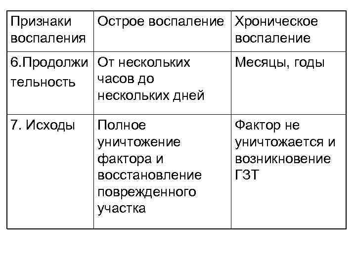 Признаки Острое воспаление Хроническое воспаления воспаление 6. Продолжи От нескольких часов до тельность нескольких дней Месяцы, годы 7. Исходы Фактор не уничтожается и возникновение ГЗТ Полное уничтожение фактора и восстановление поврежденного участка