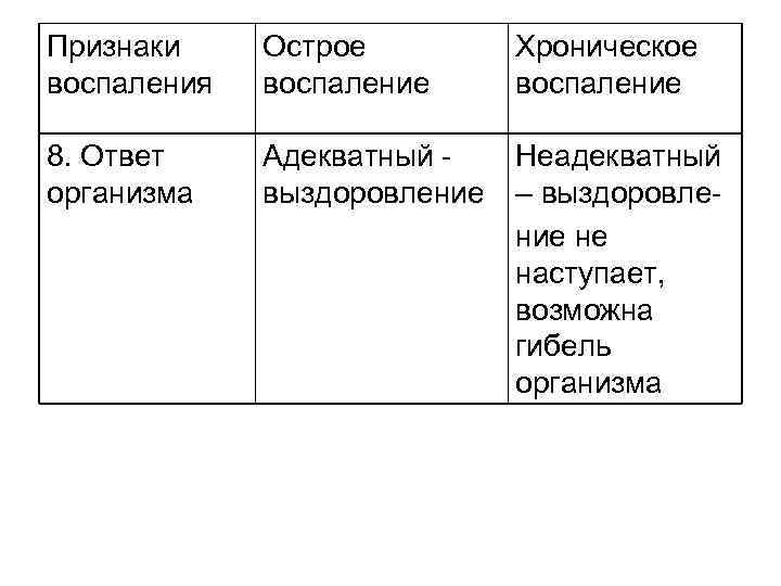 Признаки воспаления Острое воспаление Хроническое воспаление 8. Ответ организма Адекватный выздоровление Неадекватный – выздоровление не наступает, возможна гибель организма