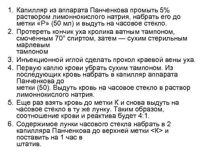 1. Капилляр из аппарата Панченкова промыть 5% раствором лимоннокислого натрия, набрать его до метки «Р» (50 мл) и выдуть на часовое стекло. 2. Протереть кончик уха кролика ватным тампоном, смоченным 70° спиртом, затем — сухим стерильным марлевым тампоном 3. Инъекционной иглой сделать прокол краевой вены уха. 4. Первую каплю крови убрать сухим тампоном. Из последующих кровь набрать в капилляр аппарата Панченкова до метки (50). Выдуть кровь на часовое стекло в раствор лимоннокислого натрия. 5. Еще раз взять кровь до метки К и снова выдуть на часовое стекло в ту же лунку. Таким образом, соотношение крови и реактива будет 4: 1. 6. Содержимое лунки часового стекла набрать в 2 капилляра Панченкова до верхней метки <К> и поставить на 1 час в штатив.