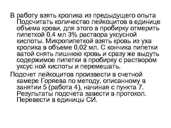 В работу взять кролика из предыдущего опыта Подсчитать количество лейкоцитов в единице объема крови, для этого в пробирку отмерить пипеткой 0, 4 мл 3% раствора уксусной кислоты. Микропипеткой взять кровь из уха кролика в объеме 0, 02 мл. С кончика пипетки ватой снять лишнюю кровь и сразу же выдуть содержимое пипетки в пробирку с раствором уксус ной кислоты и перемешать. Подсчет лейкоцитов произвести в счетной камере Горяева по методу, описанному в занятии 5 (работа 4), начиная с пункта 7. Результаты подсчета завести в протокол. Перевести в единицы СИ.