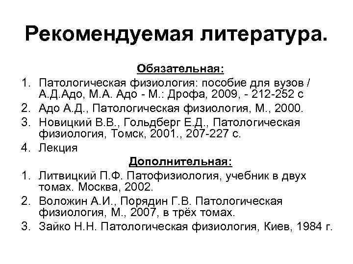 Рекомендуемая литература. 1. 2. 3. 4. 1. 2. 3. Обязательная: Патологическая физиология: пособие для вузов / А. Д. Адо, М. А. Адо - М. : Дрофа, 2009, - 212 -252 с Адо А. Д. , Патологическая физиология, М. , 2000. Новицкий В. В. , Гольдберг Е. Д. , Патологическая физиология, Томск, 2001. , 207 -227 с. Лекция Дополнительная: Литвицкий П. Ф. Патофизиология, учебник в двух томах. Москва, 2002. Воложин А. И. , Порядин Г. В. Патологическая физиология, М. , 2007, в трёх томах. Зайко Н. Н. Патологическая физиология, Киев, 1984 г.