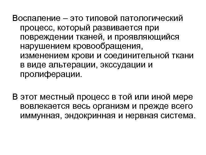 Воспаление – это типовой патологический процесс, который развивается при повреждении тканей, и проявляющийся нарушением кровообращения, изменением крови и соединительной ткани в виде альтерации, экссудации и пролиферации. В этот местный процесс в той или иной мере вовлекается весь организм и прежде всего иммунная, эндокринная и нервная система.