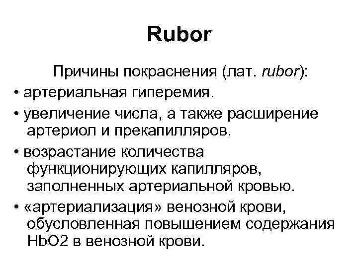 Rubor Причины покраснения (лат. rubor): • артериальная гиперемия. • увеличение числа, а также расширение артериол и прекапилляров. • возрастание количества функционирующих капилляров, заполненных артериальной кровью. • «артериализация» венозной крови, обусловленная повышением содержания Hb. O 2 в венозной крови.