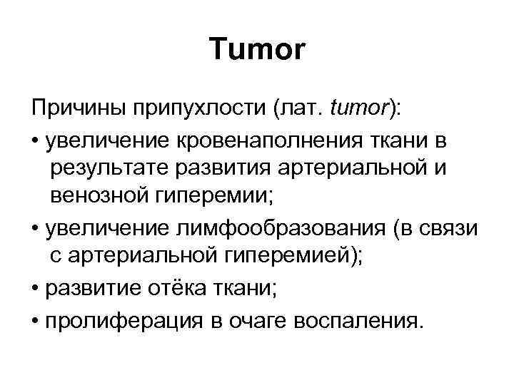 Tumor Причины припухлости (лат. tumor): • увеличение кровенаполнения ткани в результате развития артериальной и венозной гиперемии; • увеличение лимфообразования (в связи с артериальной гиперемией); • развитие отёка ткани; • пролиферация в очаге воспаления.