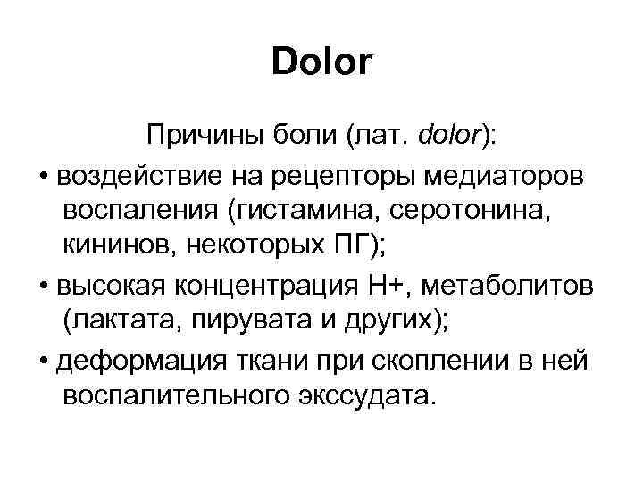 Dolor Причины боли (лат. dolor): • воздействие на рецепторы медиаторов воспаления (гистамина, серотонина, кининов, некоторых ПГ); • высокая концентрация H+, метаболитов (лактата, пирувата и других); • деформация ткани при скоплении в ней воспалительного экссудата.