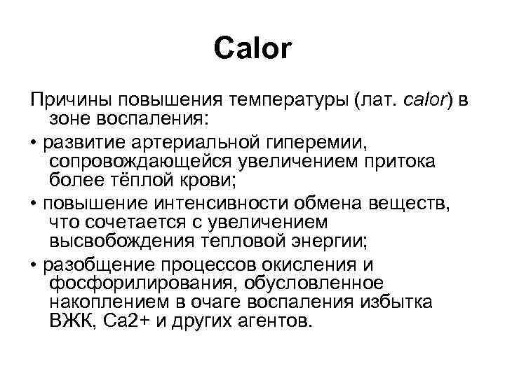 Calor Причины повышения температуры (лат. calor) в зоне воспаления: • развитие артериальной гиперемии, сопровождающейся увеличением притока более тёплой крови; • повышение интенсивности обмена веществ, что сочетается с увеличением высвобождения тепловой энергии; • разобщение процессов окисления и фосфорилирования, обусловленное накоплением в очаге воспаления избытка ВЖК, Ca 2+ и других агентов.