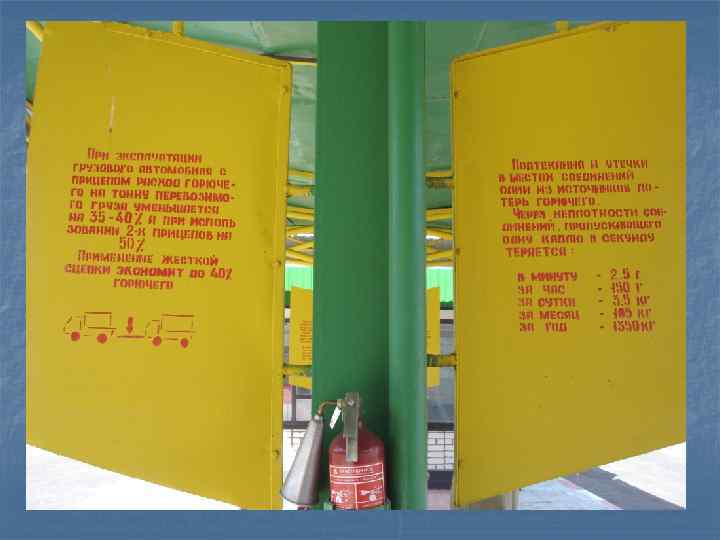 -учет горючего и масел ведется правильно и своевременно; - пункт заправки обеспечен исправными средствами пожаротушения, правила пожарной безопасности и меры безопасности соблюдаются; -имеется наглядная агитация по экономии горючего; - положенная документация ведется в соответствии с требованиями руководств