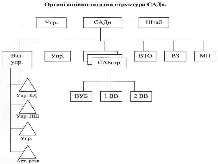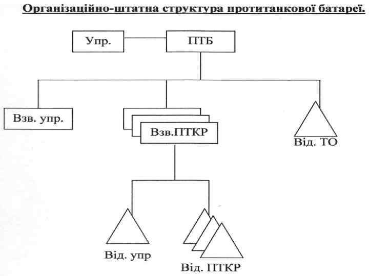 2. Організація, озброєння, бойова техніка та призначення артилерійського дивізіону, зенітно-ракетного дивізіону, протитанкової батареї Артилерійський дивізіон основний вогневий і тактичний підрозділ артилерії. Він може вести вогонь всіма або декількома батареями по одній цілі, групі цілей або батареями по різних цілях. Артилерійський дивізіон складається із управління, штабу, взводу управління, трьох самохідних артилерійських (якщо дивізіон причепний) батарей, взводу технічного обслуговування, взводу забезпечення, медичного пункту. Взвод управління дивізіону призначений для ведення розвідки і забезпечення зв'язку складається з відділення управління (КД), відділення управління (НШ), відділення артилерійської розвідки і відділення управління. Всього у взводі: о/с – 15 чол. , КШМ – 2 шт. , ПРП-3 – 1 шт. , АК – 15 шт. , ПМ – 1 шт. Самохідна артилерійська батарея – вогневий і тактичний підрозділ артилерії, на озброєнні якої знаходиться сучасне озброєння і засоби зв'язку. Батарея може одночасно уражати 1 -2 цілі стрільбою з закритої вогневої позиції кілька цілей в залежності від кількості гармат батареї вогнем прямою наводкою. Самохідна артилерійська батарея складається із взводу управління батареї, першого вогневого взводу, другого вогневого взводу. Всього в батареї є: о/с – 55 чол. , САУ – 6 шт. , УРАЛ 4320 – 3 шт. , КШМ – 2 шт. , РПГ 7 в – 3 шт. , ГАЗ-66 – 1 шт. , ПМ – 7 шт. , АК – 55 шт. Вогневий взвод виконує вогневі задачі в складі батареї, а в окремих випадках самостійно.