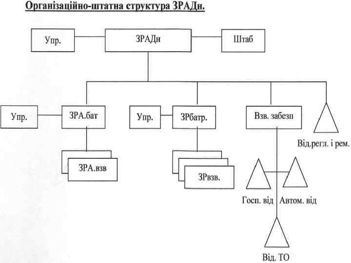 Зенітний ракетно-артилерійський дивізіон. ЗРАДн є одним із основних засобів ураження повітряного противника. Він призначений для захисту командних пунктів управління полку та всіх його підрозділів від ударів повітряного противника на низьких висотах. Зенітні підрозділи знаходяться в бойових, передбойових, похідних порядках батальйону. Для ураження противника застосовується зосереджений вогонь і вогонь по декількох цілях. Зосереджений вогонь проводиться декількома взводами, бойовими машинами для знищення найбільш важливих групових або одиночних повітряних цілей. Роззосередження вогню проводиться для одночасного знищення декількох повітряних цілей.