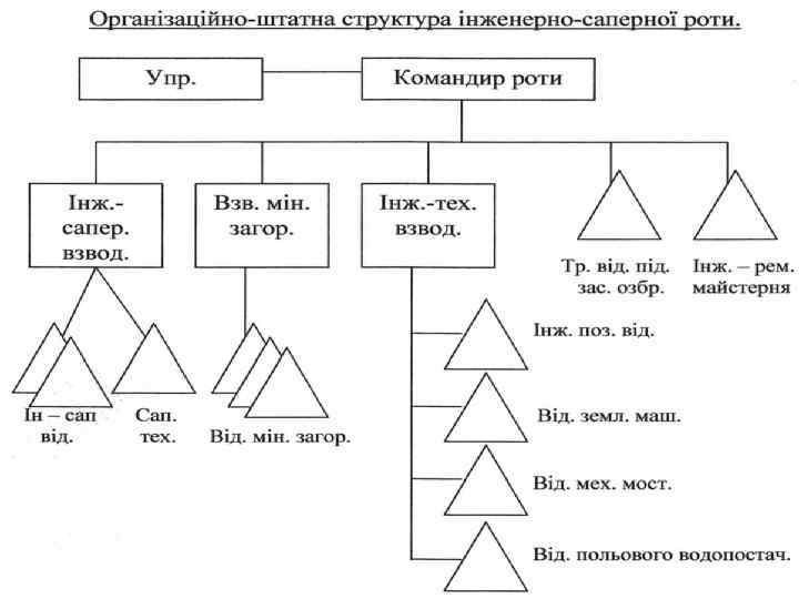 Інженерно-саперна рота. Інженерне забезпечення в полку організовується і проводиться з метою забезпечення підрозділів полку необхідними даними для своєчасного і скритого висування, розгортання, маневру і успішного виконання бойових завдань, підвищення ступеню захисту особового складу та техніки від усіх засобів ураження, а також для нанесення ураження противнику і ускладнення його дій. Ці завдання виконує інженерно-саперна рота разом з загальновійськовими підрозділами полку. В наступі інженерно-саперна рота використовується, як правило в повному складі, що забезпечує скритність підготовки наступу і дає можливість більш ефективно використовувати інженерні засоби. При переході до оборони більш ефективно рота застосовується децентралізовано, інженерні підрозділи придаються підрозділом першого ешелону, які вирішують найбільш важливі задачі.