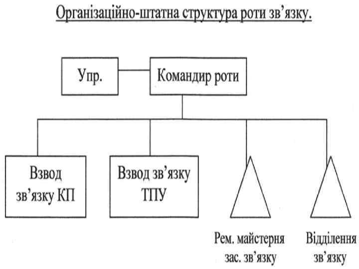 Рота зв'язку. Рота зв’язку призначена для забезпечення надійного, безперервного зв’язку та управління підрозділами у всіх видах бою. Успіх сучасного бою залежить від твердого, безперервного, стійкого, оперативного і скритого управління підрозділами. Важлива роль в управлінні підрозділами належать засобам зв'язку, які забезпечують зв'язок командира і штабу з бойовими підрозділами, з сусідами, з різними родами військ, передачу сигналів оповіщення, керівництва технічним і тиловим забезпеченням. Для впевненого виконання усіх завдань зв'язок повинен бути: своєчасним, говірним і скритим. Зв'язок з підрозділами полку організовується відповідно рішенням командира, вказівками начальниками штабу і розпорядженням старшого штабу, з урахуванням протидії противника на систему зв'язку. слайд № 7/2 -5 Радіозасоби використовуються в усіх видах бою, а часом бувають єдиними. Проводові засоби зв'язку частіше будуть використовуватись в очікувальних районах, при розташуванні військ на місці і в обороні.