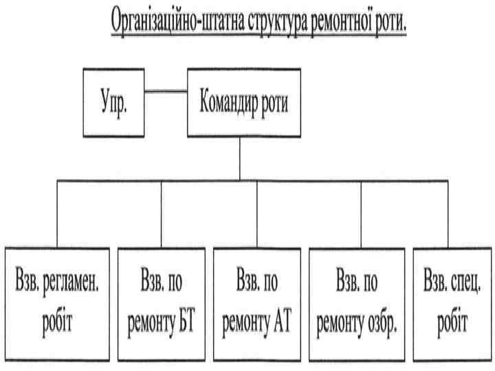 Рем. рота Ремонтна рота призначена для проведення поточного ремонту, Всього в ремонтній роті Особового складу 90 РПГ-7 1 технічного обсуговування № 2 озброєння, надання допомоги підрозділам при проведенні силами обслуг технічного обслуговування № 1, сезонного ЗІЛ 131 14 АК-74 80 обслуговування озброєння, технічного обслуговування № 1 при МТОАТ 2 ПАРМ 1 короткочасному зберіганні і технічного обслуговування № 1 та № 2 при Танкові тягачі 2 1 тривалому зберіганні озброєння. МРС БТС Зарядна станція 1