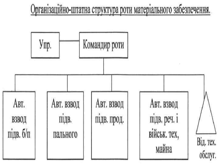Взвод технічного обслуговування призначений для технічного обслуговування озброєння і техніки та підготовки озброєння і евакуації техніки з поля бою. Він складається із відділення технічного обслуговування (АТ), відділення обслуговування, евакуаційного відділення. Всього у взводі – о/с 14 чол. , ПМ – 2 шт. , АК – 14 шт. , МТО-АТ – 1 шт. Взвод забезпечення призначений для підвозу боєприпасів, заправки техніки пальним, харчуванням о/с, забезпечення підрозділів речовим майном. Він складається із автомобільного відділення і господарського відділення. Всього у взводі – о/с 6 чол. , АК – 6 шт. , ПМ – 1 шт. Медичний пункт призначений для надання лікарської допомоги пораненим, хворим і їх евакуації. Медичний пункт має: особового складу – 6 чол. , АК – 6 шт. , ПМ – 1 шт.