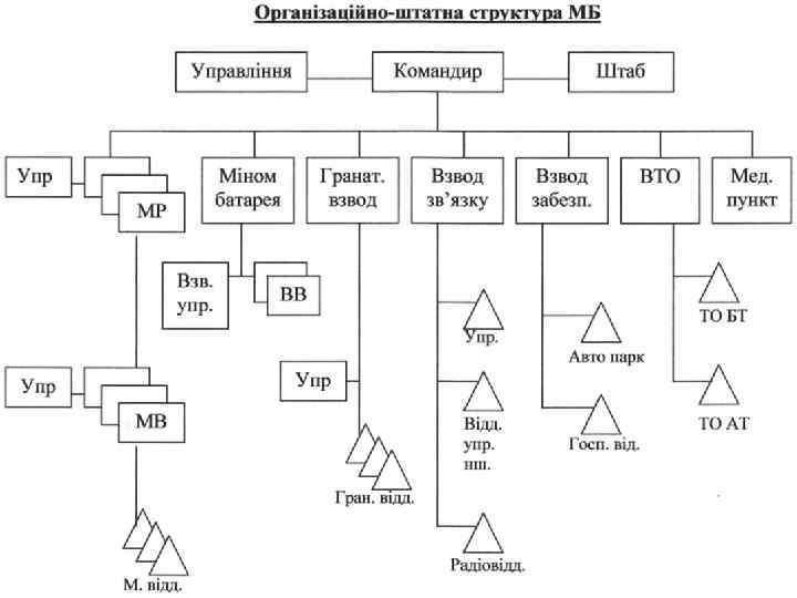 В механізованому відділенні є: 1. Командир бойової машини; 2. 3 аступник командира бойової машини – навідник-оператор; 3. Старший стрілець; 4. Стрілець; 5. Кулеметник; 6. Помічник кулеметника; 7. Гранатометник; 8. Помічник гранатометника; 9. Механік-водій. Мінометна батарея вогневий підрозділ, який складається із трьох взводів. Вона призначена для знищення і подавления живої сили та вогневих засобів противника, розташованих відкрито, в окопах, в бліндажах, на зворотних схилах висот. Мінометна батарея складається із управління (6 чол. ), взводу управління (відділення розвідки і відділення зв'язку) – 9 чол. , 1 -го вогневого взводу (З мінометні розрахунки) – 20 чол. , і 2 -го вогневого взводу 19 чол. Всього в батареї особового складу – 54 чол. , М-120 – 6 шт. , Г-66 – 9 шт. , АК – 54 шт. Гранатометний взвод призначений для знищення броньованих цілей противника і живої сили у своєму складі має: о/с – 14, АГС-17 – 6 шт. , РПГ-76 – 3 шт. , АК-74 – 14 шт.