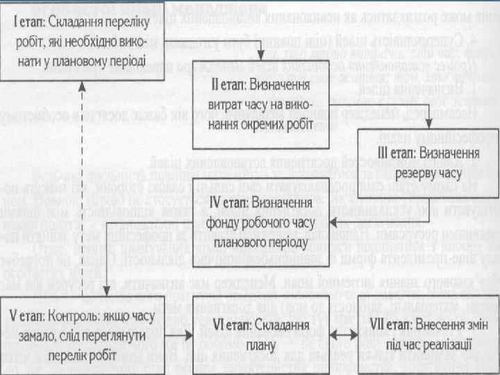 1. Складання переліку завдань. 2. Визначення витрат часу на виконання робіт. 3. Резервування часу (у відношенні 60: 40) 4. Прийняття рішень за пріоритетами та передорученням певних справ. 5. Контроль (урахування незробленого).